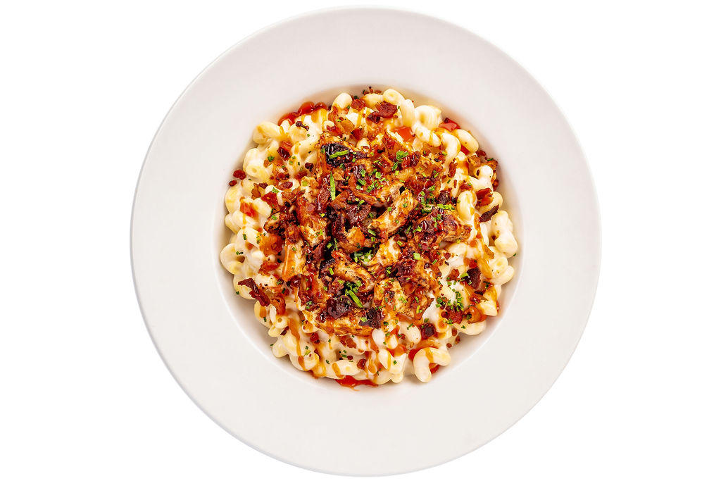 White-cheddar mac 'n' cheese with grilled or Double Dipped fried chicken, bacon & chived, drizzled with Honey BBQ Sauce