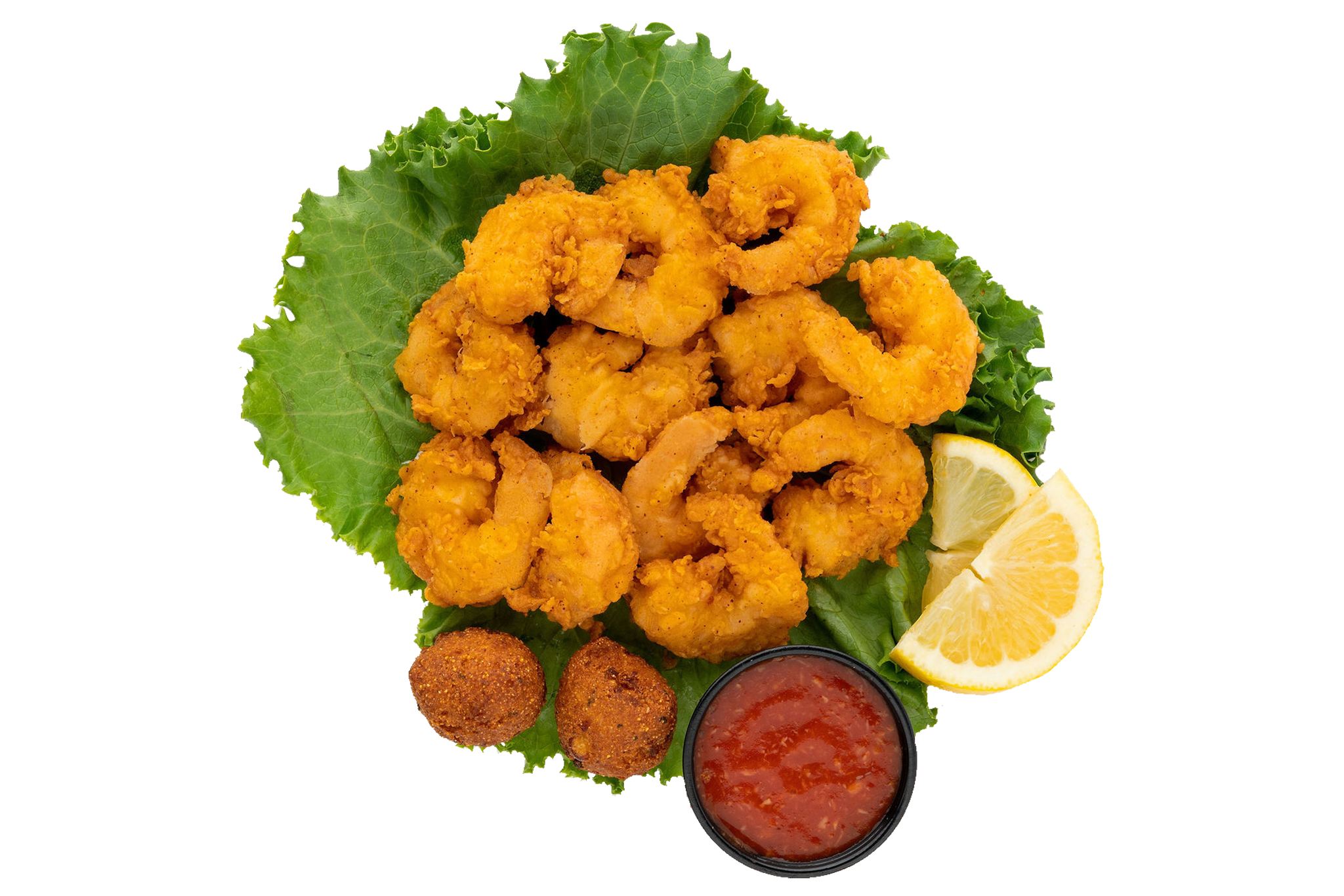 Grilled shrimp tossed in Cajun seasoning or hand-breaded shrimp fried golden and served with hush puppies and your choice of cocktail or tartar sauce.