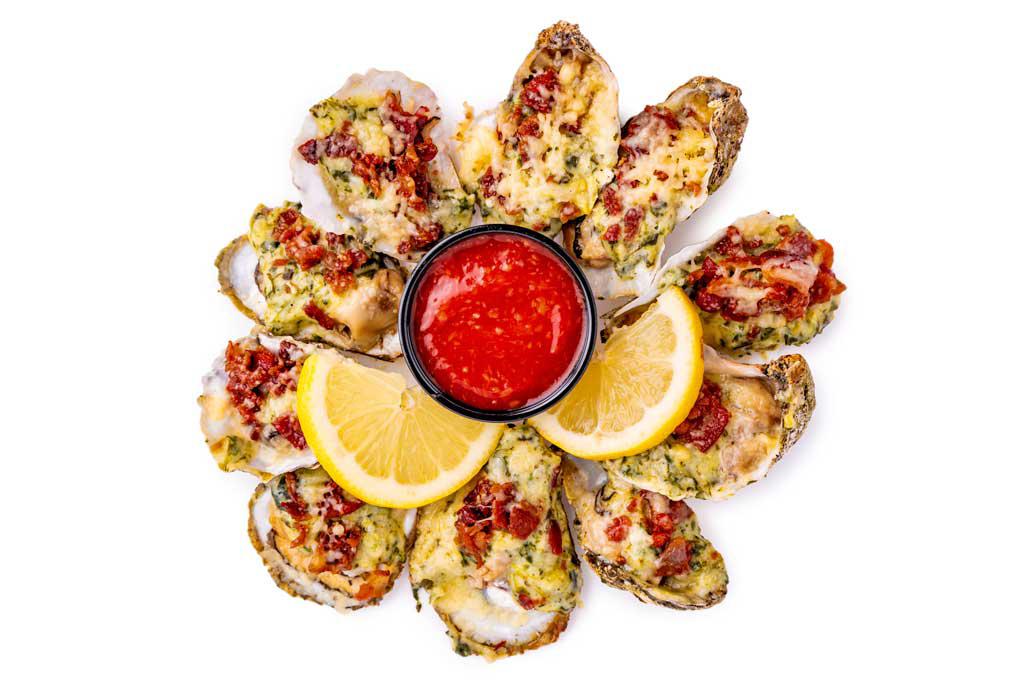 Spinach & artichoke dip, bacon & Parmesan cheese. Oysters come in a half dozen or dozen.
