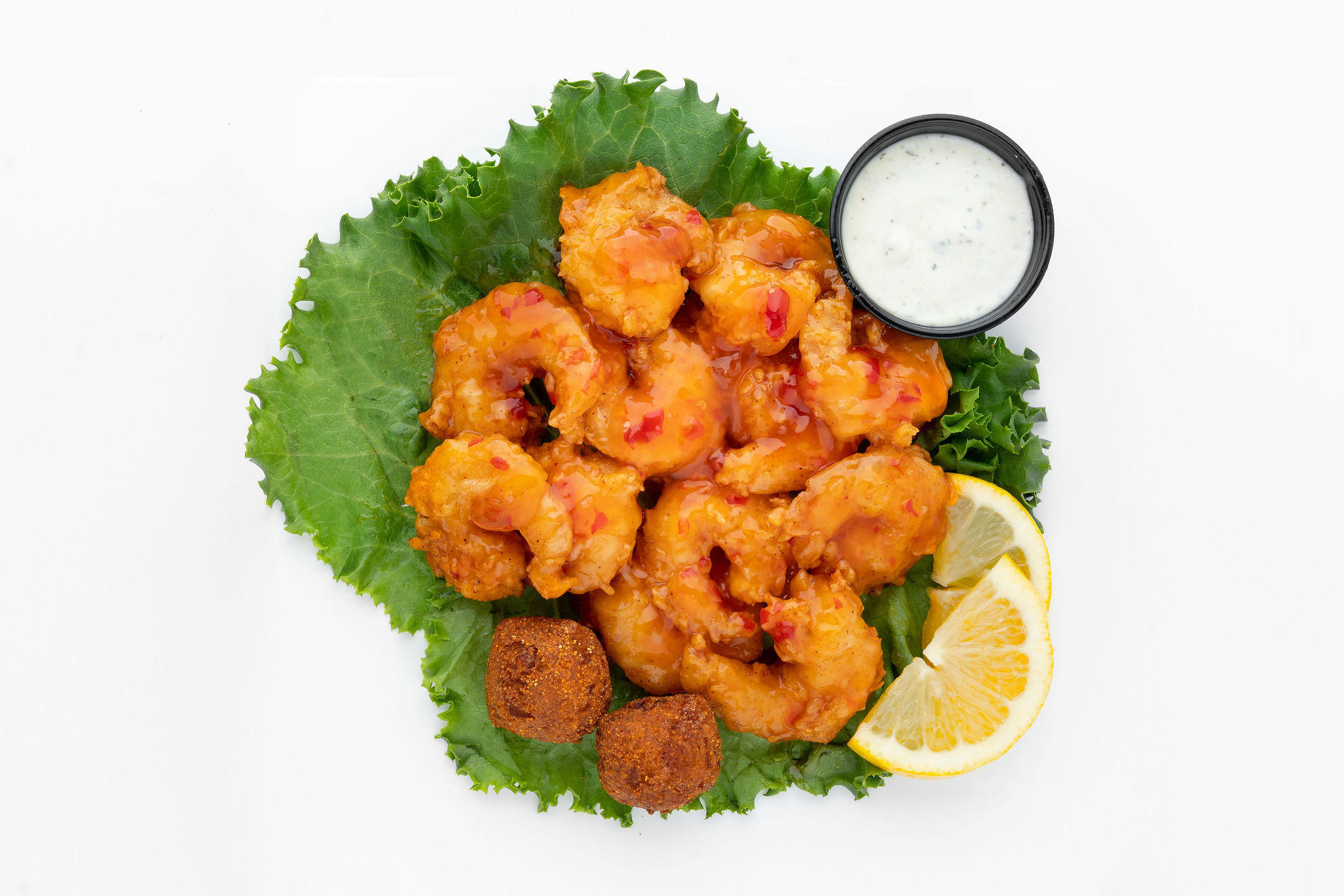 Grilled or hand-breaded shrimp tossed in your choice of Signature Sauce. Served with hushpuppies, ranch or blue cheese & choice of main side.