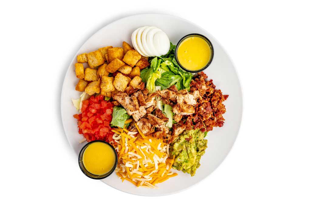 Our house salad with bacon, egg, guacamole and our fresh grilled chicken breast