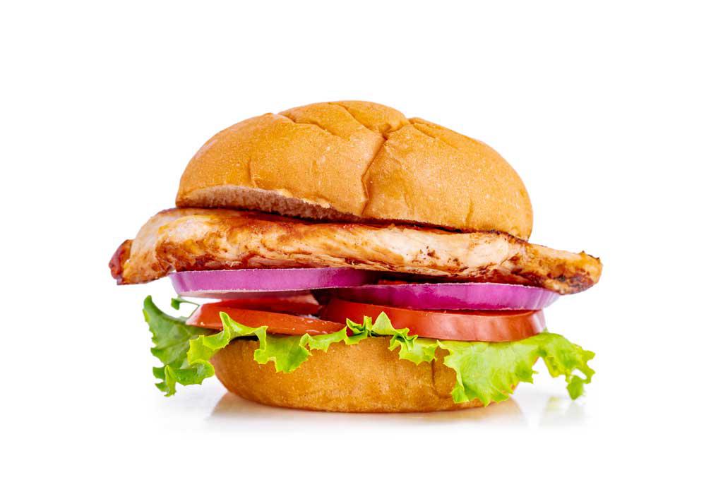 Grilled chicken with lettuce, tomato, onion & pickle on a Martin's Potato Bun.