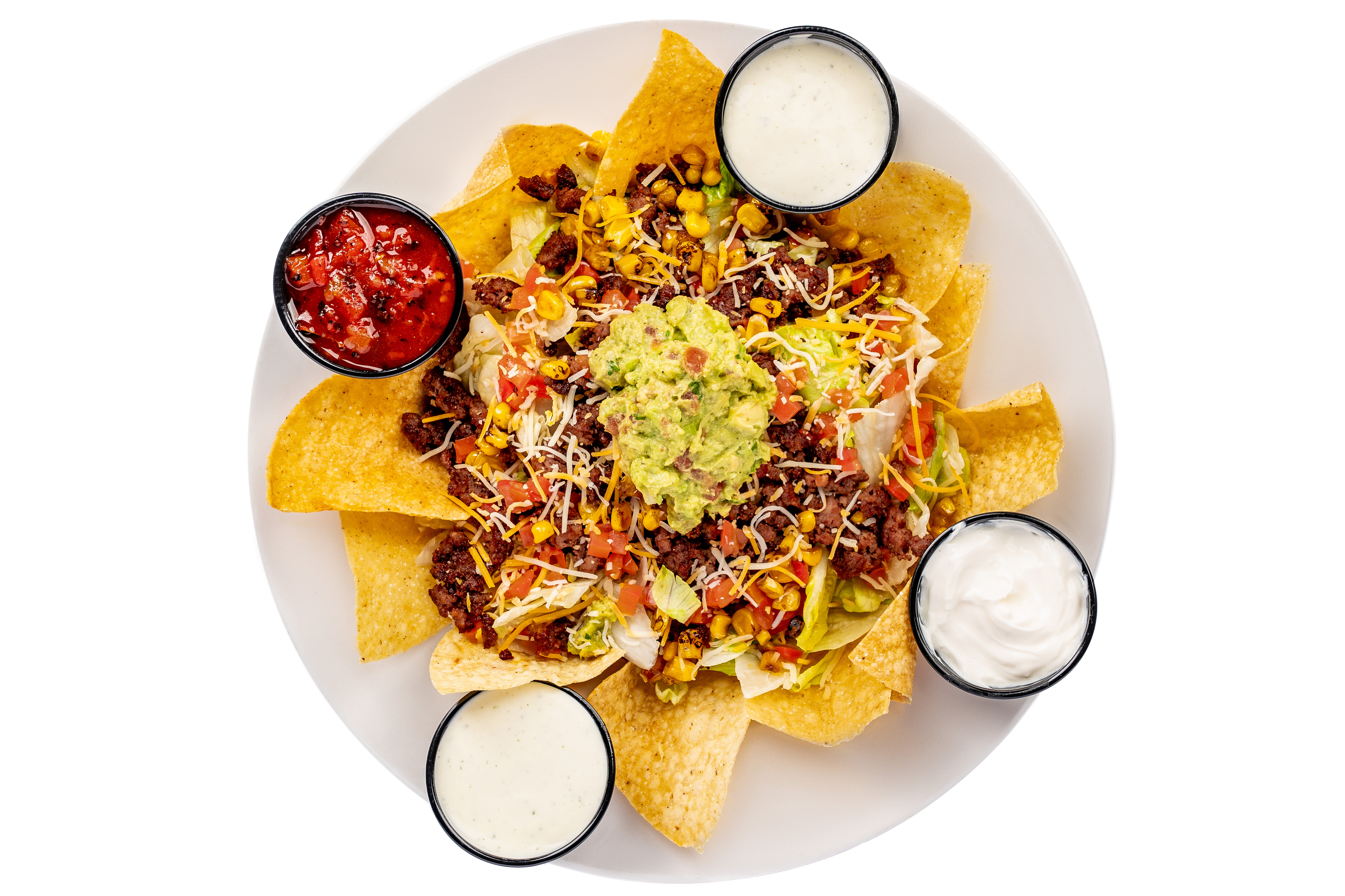 Chicken or ground beef, corn, tomatoes, guacamole, cheese, tortilla chips & salsa