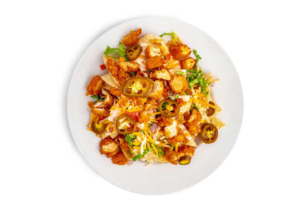 Fresh tortilla chips topped with queso cheese, lettuce, tomato, onion, shredded cheese, jalapeno, and your choice of grilled chicken breast or hand-breaded chicken tenders tossed in any of our Signature Sauces.