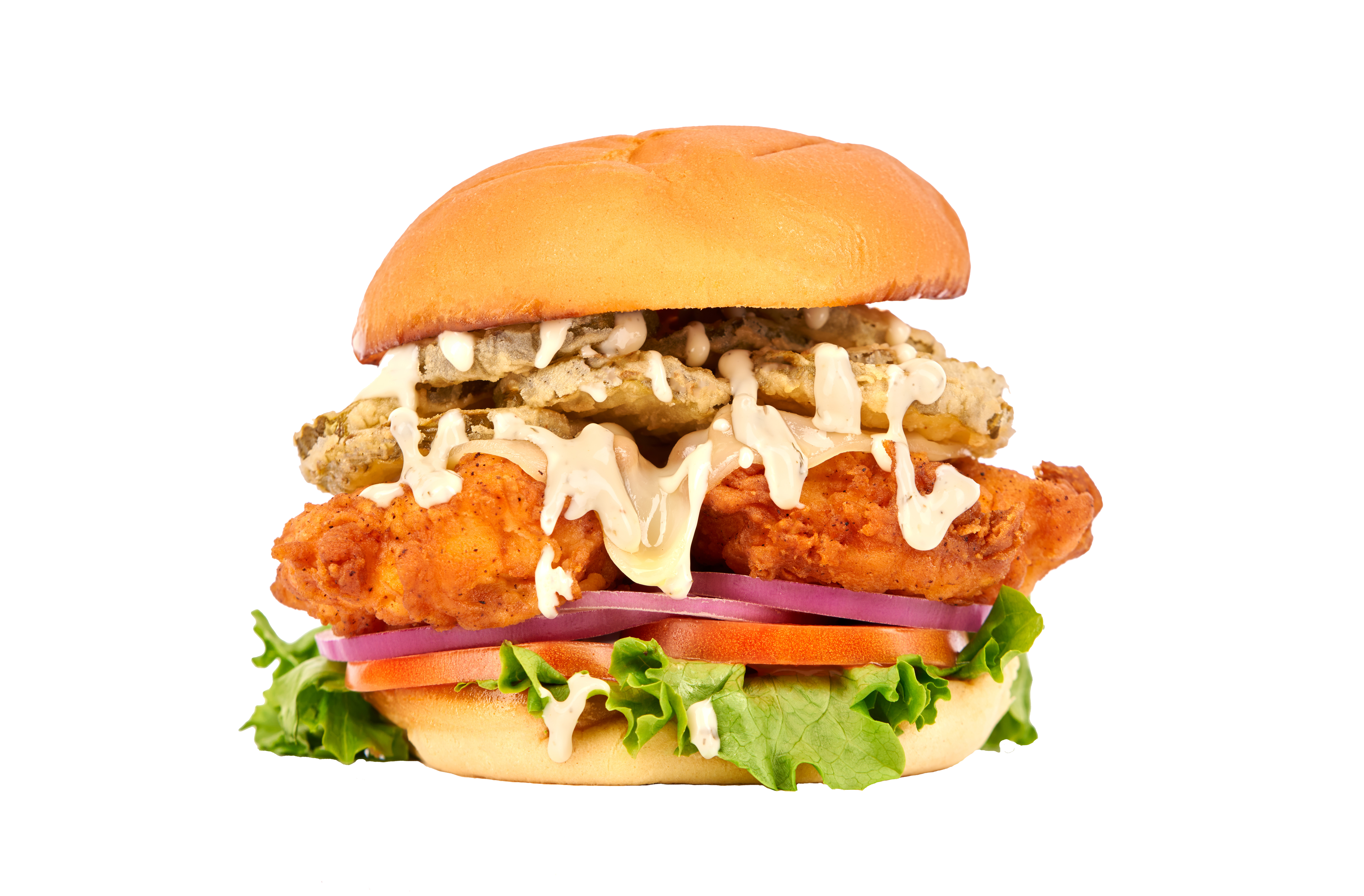Fresh grilled or hand-breaded chicken with our famous fried pickles, our NEW dill pickle aioli, lettuce, tomato, onion, pickle on a Martin's Potato Bun
